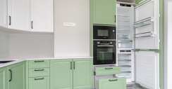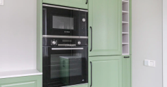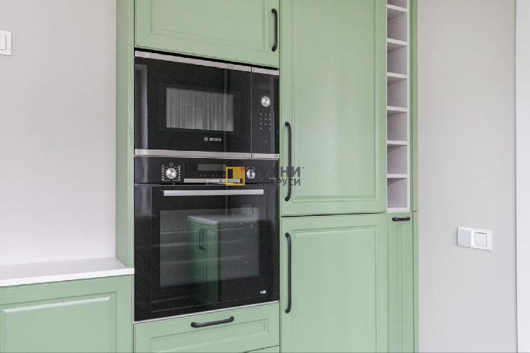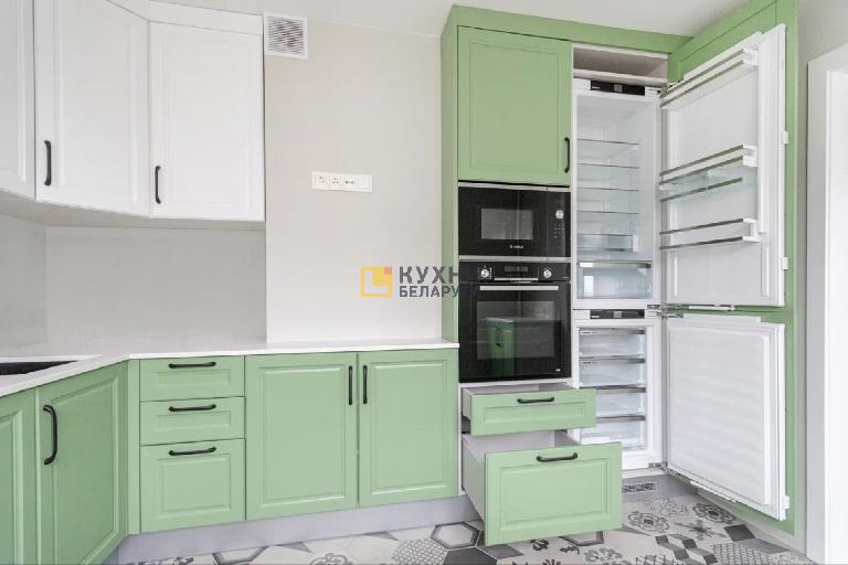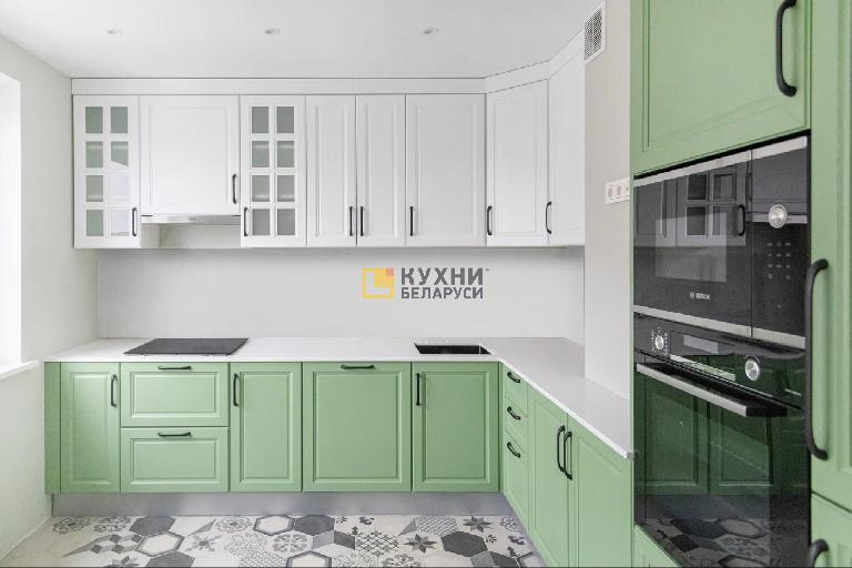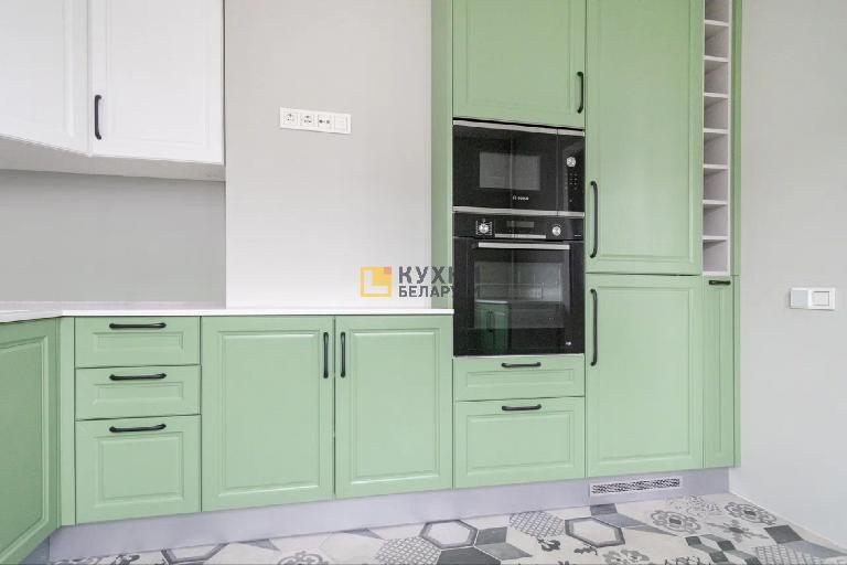 У гарнитура простой, но изящный дизайн, выполненный в стиле неоклассики. В нем преобладают глухие филенчатые фасады, дополняют их две застекленные решетчатые створки. Изюминка комплекта — его палитра. Верх, корпус, столешница и фартук, выполнены в белом цвете, а фасады — в нежном зеленом оттенке. Такая палитра способна поднять настроение, избавить от стресса и создать уютную обстановку на кухне.