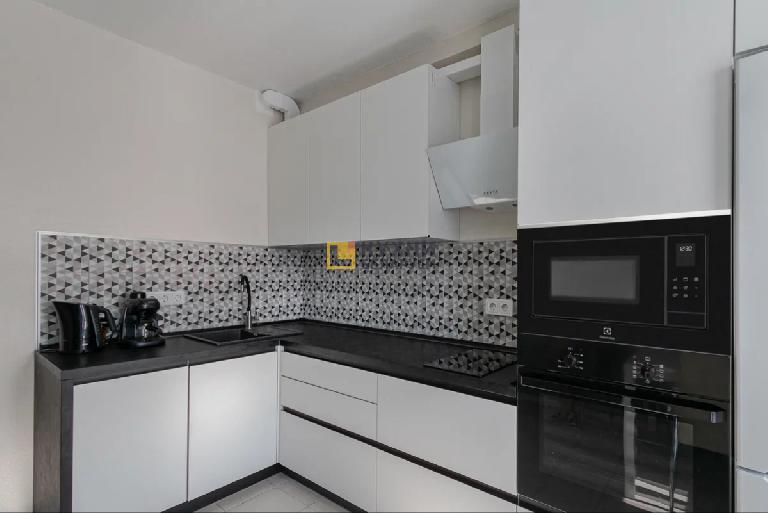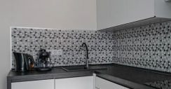 Фасады выполнены в белом оттенке. Под цвет им мы установили белую открытую вытяжку. Корпус, столешница и торец темного цвета Вулкано удачно перекликаются с такой же темной мойкой и черной встроенной техникой. Подчеркивает такую палитру фартук с активным рисунком в светло-серых и черном оттенках. Монохромный дизайн позволяет использовать гарнитур в качестве основы для оформления дизайна кухни или же направить на мебель акцентную роль.