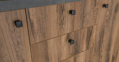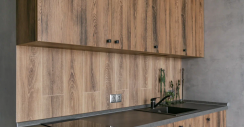 У гарнитура лаконичный, но интересный дизайн. Он выполнен в древесных оттенках, на нем отсутствуют акцентные детали. Даже фартук изготовлен под цвет фасада. Ручки-кнопки идеально вписываются в рисунок «под дерево» и становятся почти незаметными.
