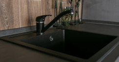 При производстве гарнитура используются ЛДСП и ДСП. Столешница — из акрилового камня, покрытие фасадов — ПВХ-пленка. Все эти материалы экологичны и безопасны, не разрушаются под действием влаги, выдерживают температурные перепады и механические воздействия.