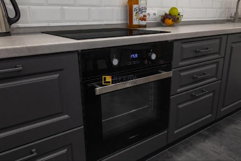 Прямой гарнитур «ПФК214» — хорошее решение для любых кухонных пространств. Белый верх, черный, под графит, низ, рамочные фасады и ручки-скобы подчеркивают классическую направленность комплекта.