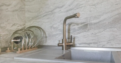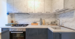 При изготовлении гарнитура мы использовали ЛДСП и ПВХ-пленку. Эти материалы защищают мебель от воздействия повышенной влажности, пара, перепадов температур и механических воздействий. Поэтому даже при контакте с водой и другими особенностями экстремального кухонного микроклимата гарнитур не трескается и не деформируется. А столешница из искусственного камня толщиной 3,8 см позволяет ставить на нее тяжелые и горячие предметы. Так что даже при интенсивной эксплуатации мебель будет служить вам долгие годы.