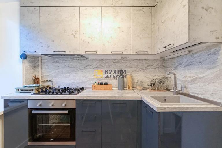 У мебели лаконичный внешний вид, характерный для современного стиля. Строгие фасады оснащены ручками-скобами без дополнительного декора. Нижний глянцевый модуль выполнен в оттенке, близком к графитовому. Верхний матовый — в сером цвете с темными вкраплениями. Благодаря такой неоднородной палитре гарнитур может играть акцентную роль в дизайне интерьера.