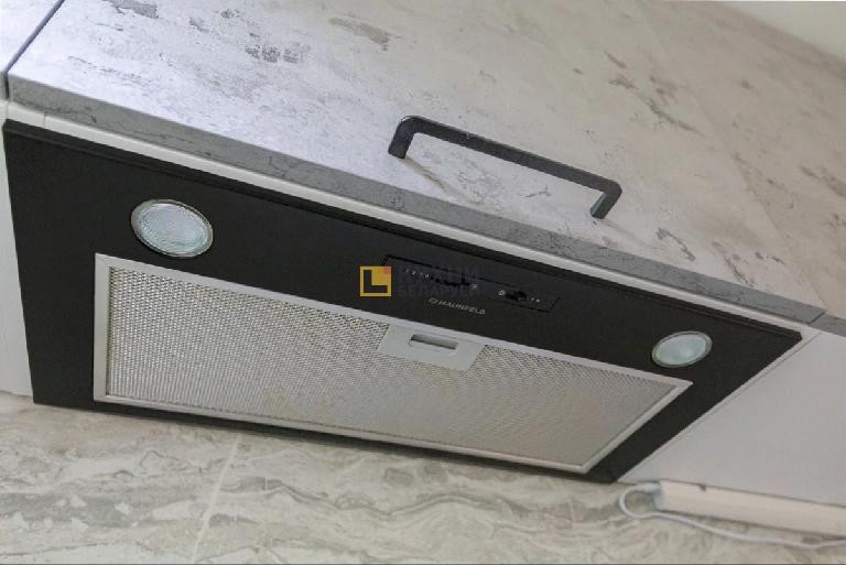 Проект разработан с целью сделать кухонное пространство максимально функциональным. Здесь достаточное количество ящиков и шкафов для размещения необходимых приспособлений и посуды. Шкаф для вытяжки оснащен несколькими полками, поэтому в нем также можно хранить небольшие предметы. Пространство между навесным блоком и потолком закрыто декоративным коробом. Это делает конструкцию эстетичнее и защищает пространство от скопления пыли.