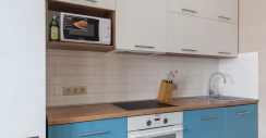 Несмотря на компактность гарнитура, в нем поместится все необходимое. Есть место под посудомоечную машину и открытая полка для микроволновки, декора или посуды. Благодаря многочисленным шкафчикам и ящикам все будет под рукой.