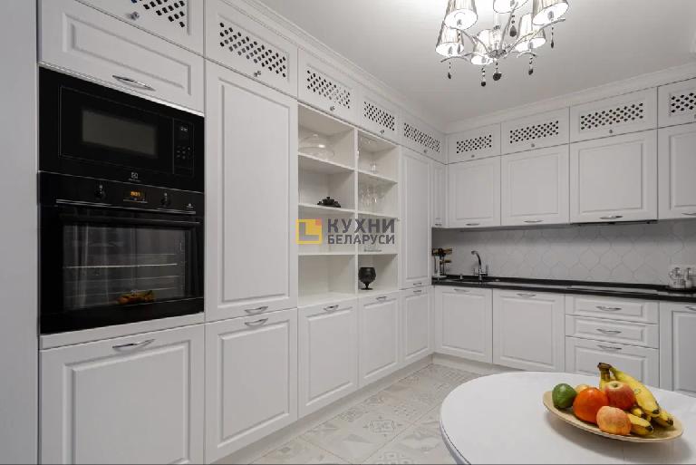 Угловой гарнитур «ПП373» в классическом стиле с нотками прованса — отличное решение для небольшой кухни или квартиры-студии. Выполненный в белых оттенках он визуально увеличивает пространство, делает его более «легким». При этом мебель очень вместительная. Среди мест хранения: