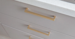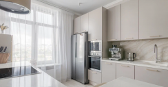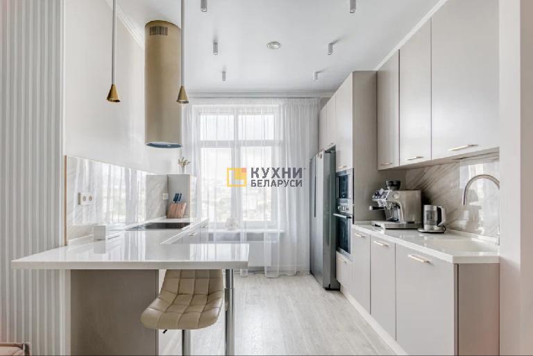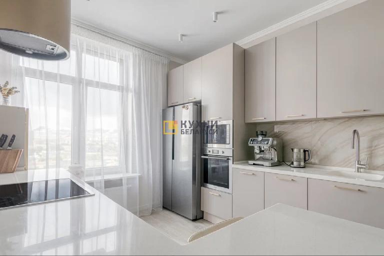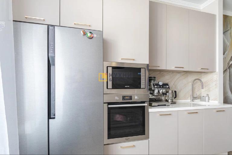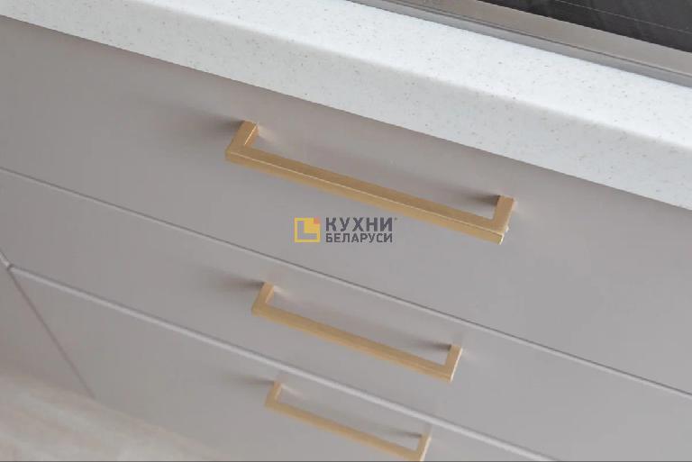 Гарнитур выполнен в светло-бежевом цвете. Он делает пространство более воздушным, легким. Дополняют его золотистые ручки-рейлинги и фартук под мрамор. Закрытые матовые фасады сочетаются с глянцевой столешницей и стеклянной створкой в витрине.