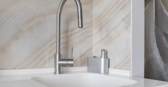 Цоколь изготовлен из ЛДСП и покрыт ламинатом, в основу фасадов вошел МДФ с эмалевым покрытием, столешница сделана из акрила. Эти материалы выдерживают воздействие влаги и перепадов температур, поэтому гарнитур прост в уходе и имеет долгий срок службы.