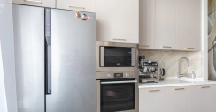 С одной стороны — модуль с нижними и навесными (под потолок) шкафчиками, пенал с нишами для микроволновки и духового шкафа и место для установки холодильника.