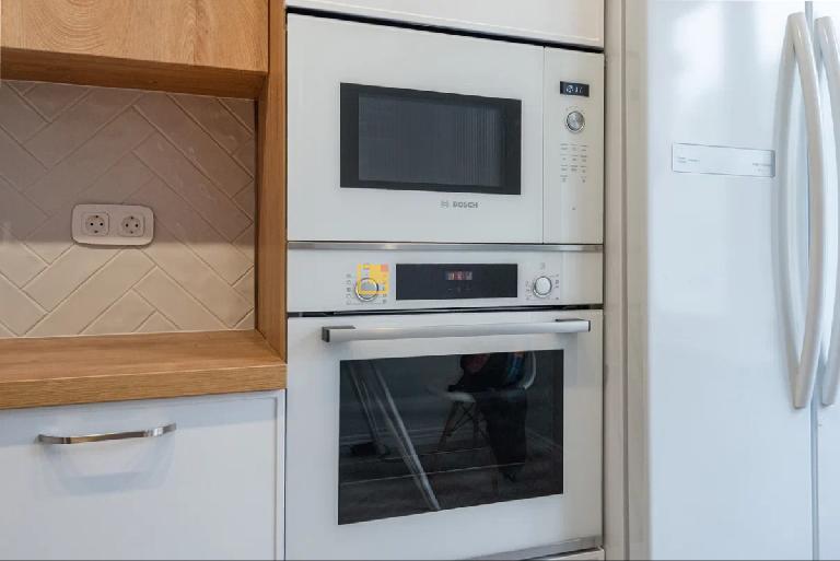 С такой кухней легко поддерживать порядок. Для техники есть отдельные ниши, поэтому духовка, микроволновка и холодильник не занимают лишнее место. Вытяжка не бросается в глаза, т.к спрятана в коробе.