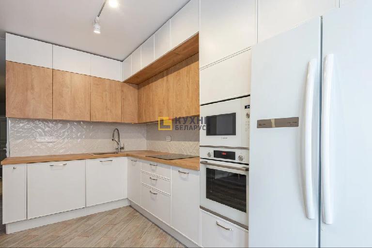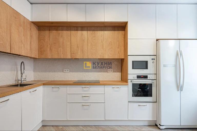 У гарнитура интересный современный дизайн. Навесные шкафы представлены в два ряда. При этом верхний выступает вперед, подчеркивая двухъярусность комплекта. Цветовая палитра также делает акцент на многослойности. Фасады выполнены в белом цвете, корпус, столешница и нижний ярус навесных шкафов — под дерево.