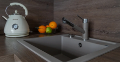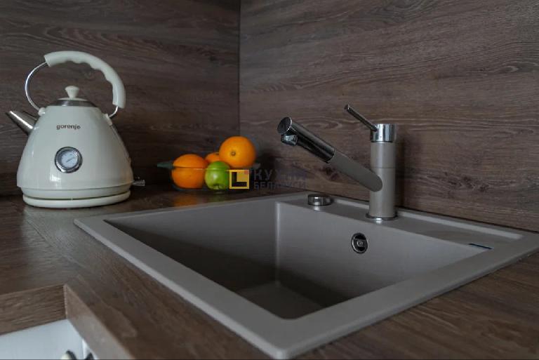 При реализации данного проекта мы использовали прочные и безопасные материалы. Для корпуса взяли ЛДСП, для фасадов — МДФ. Поэтому гарнитур получился влагостойким, устойчивым к высоким нагрузкам и механическим повреждениям. Он прост в уборке и не требует специальных средств.