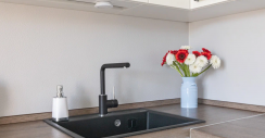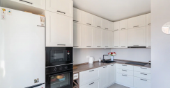 При проектировании особое внимание уделялось вместительности. Система хранения здесь увеличена за счет второго ряда навесных шкафов. Он находится под самым потолком и может использоваться для хранения вещей, которыми пользуются нечасто. Кроме привычных закрытых шкафов и ящиков, в гарнитуре есть небольшая открытая бутылочница.