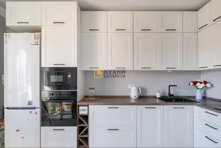 Угловой вместительный гарнитур «ЗПБО131» в стиле неоклассика станет настоящим украшением кухни. Выполненный в белых оттенках, он зрительно не нагружает пространство, а, наоборот, делает его легче и светлее. В отличие от классических гарнитуров здесь нет ярко выраженных украшений. Только рамочные фасады антично белого цвета и контрастирующие на их фоне черные ручки-рейлинги.