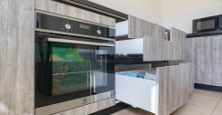 Гарнитур, выполненный в современном стиле, не имеет ручек. Все дверцы открываются по системе Push to open плавно и беззвучно. Для этого нужно просто