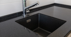 В проекте не предусмотрены верхние шкафчики, поэтому мебель визуально не нагружает пространство. При этом мест для хранения достаточно. На широкой столешнице поместится вся необходимая бытовая техника, посуду, приборы и другие предметы можно разместить в нижних шкафчиках и ящиках.