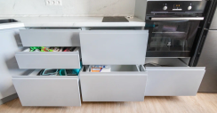 Дизайн гарнитура современный, и это прослеживается в каждой детали. В прямых гладких фасадах, в отсутствии выступающих элементов, в качественной фурнитуре и нажимном механизме. Часть створок оснащена интегрированными ручками. Они не выделяются на фоне общей композиции и остаются полностью незаметными.