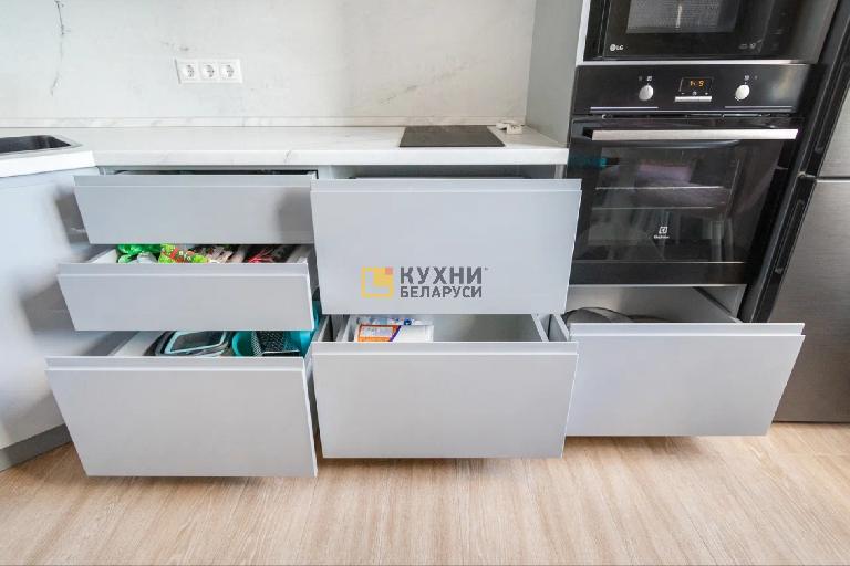 В проекте предусмотрена большая система хранения. Здесь много вместительных ящиков, глубоких шкафов, есть несколько полок в коробе для вытяжки. Для хранения редко используемых предметов мы предусмотрели шкаф над холодильником. В нем можно хранить мелкую бытовую технику, коробки или дополнительные комплекты посуды.