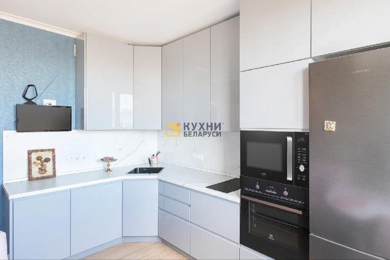 Фасады выполнены в серо-голубом оттенке с глянцевой поверхностью. Такое решение подойдет для любой кухни, даже для небольшой. Т.к. мебель визуально увеличивает пространство и добавляет в него света.