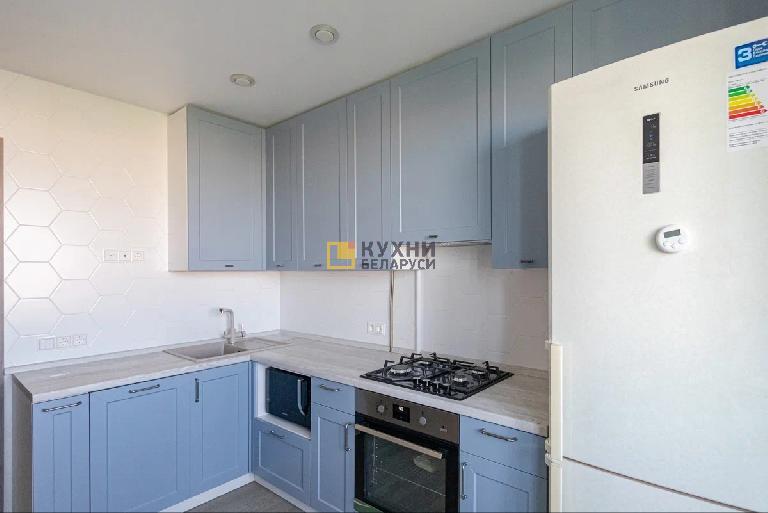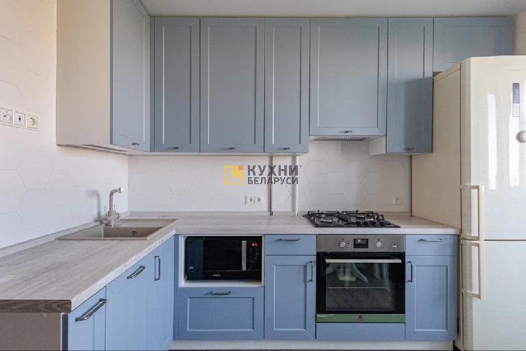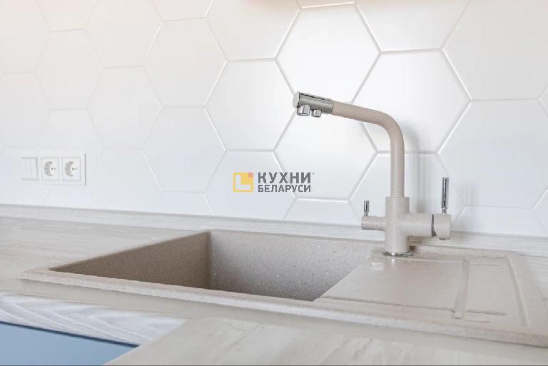 У гарнитура трехцветная палитра. Корпус выполнен в белом цвете, дверцы в оттенке «Серенити», столешница — под светлое дерево. Такая комбинация придает помещению уюта и тепла, делает атмосферу поистине домашней и комфортной. Завершают композицию рамочные фасады и черные ручки-скобы.