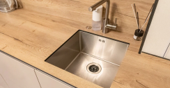 Таким образом, мы спроектировали достаточно большую систему хранения. В гарнитуре присутствует несколько вместительных ящиков и много шкафов с полками. Все фасады закрытые, поэтому можно скрыть с глаз все кухонные принадлежности и создать на кухне ощущение порядка.