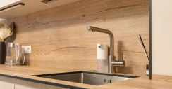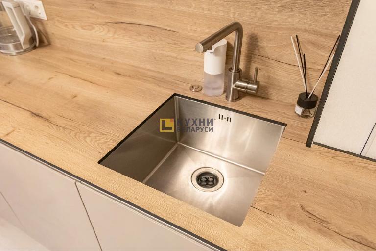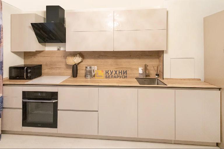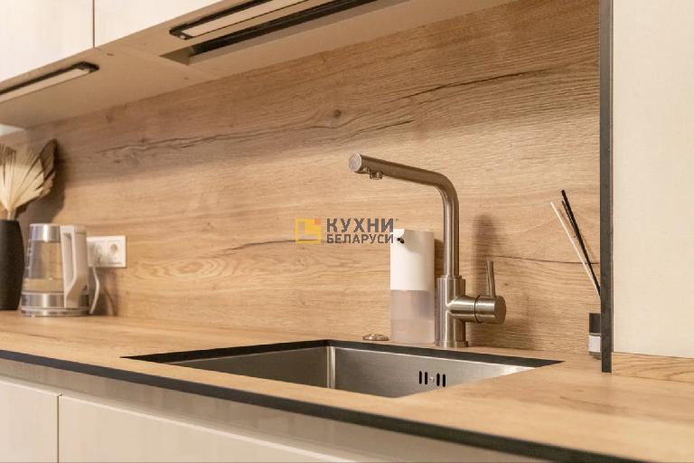 У гарнитура приятная цветовая палитра. Глянцевые фасады выполнены в кремовом оттенке и дополнены столешницей и стеновой панелью под дерево. В этом комплекте нет особых акцентов, ярких деталей и выступающих элементов. Нижний модуль оснащен интегрированными ручками, которые никак не выделяются из общей композиции. Навесные шкафы оборудованы подъемным механизмом. Открываются они с помощью легкого нажатия.