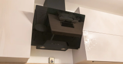 Гарнитур оборудован всей необходимой техникой. Мы установили посудомоечную машину, духовой шкаф и белую варочную панель, черную открытую современную вытяжку и небольшую мойку без острова. Также мы предусмотрели подсветку рабочей зоны, большое количество розеток. Поэтому на такой кухне комфортно готовить и использовать несколько электрических приборов одновременно.