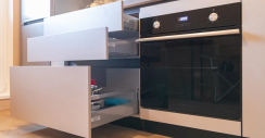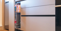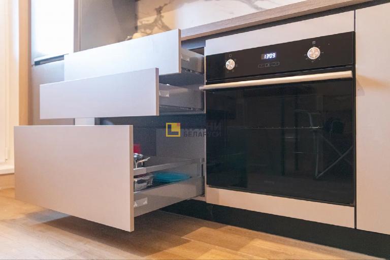 Гарнитур очень удобен в пользовании. Благодаря большому количеству вместительных ящиков, шкафов и бутылочнице у каждого предмета будет свое место. Это значит, что вам не придется тратить много времени на поиски инструмента или ингредиента. Все будет под рукой. У модели два ряда верхних шкафов. Расположены они до потолка, на одном уровне, поэтому визуально не утяжеляют конструкцию. Особенность гарнитура — глубокий вместительный шкаф над холодильником. Его также можно использовать в качестве антресоли и хранить в нем более крупные предметы. Дополнительные места хранения есть в коробе для вытяжки. Он оснащен четырьмя полками, поэтому тоже очень вместительный.
