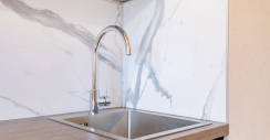 Для экономии площади рабочей зоны мы предусмотрели открытую полку под микроволновку и мойку без острова. Также здесь установлена посудомоечная машина.