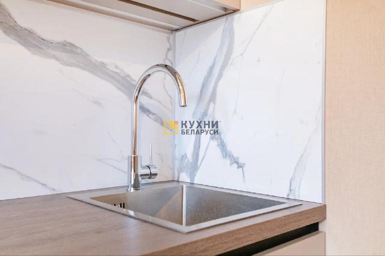 Дизайн гарнитура приближен к стилю модерн. Он максимально лаконичный, без лишних деталей. Фасады прямые, матовые. Оснащены нажимным механизмом. Палитра сдержанная. Нижний модуль выполнен в белом цвете, верхний — в светло-бежевом. Дополняет композицию столешница под дерево и стеновая панель под мрамор.
